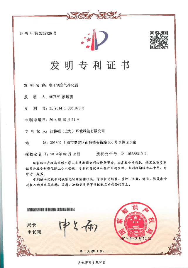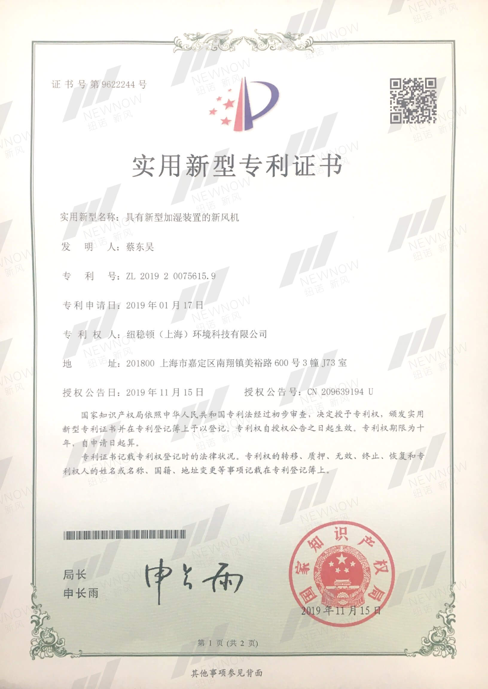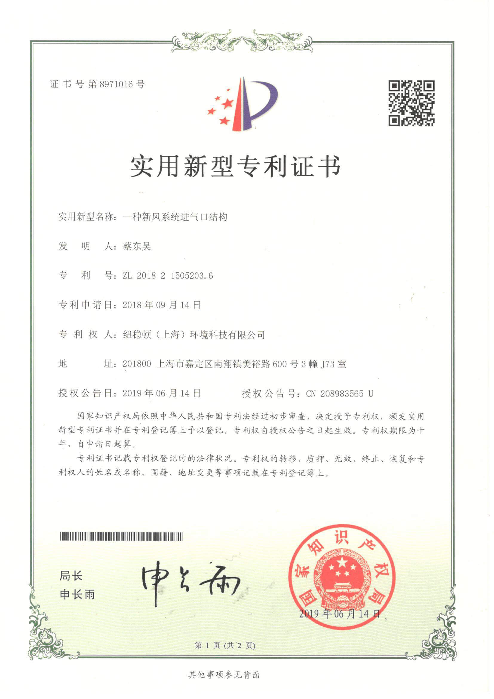 紐諾(中國)已獲授權專利近20個,同時參與多項國家新風行業標準制定。