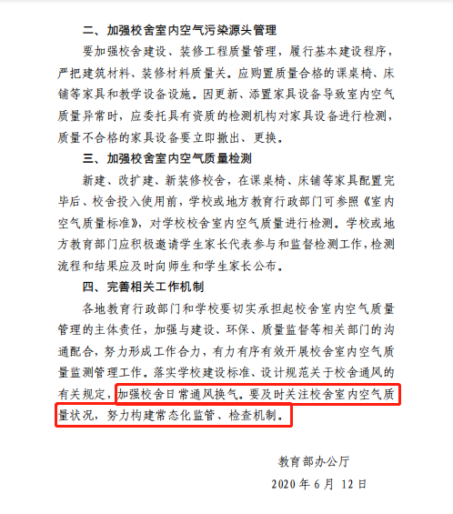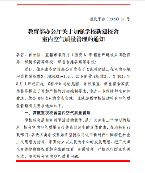 為此,教育部辦公廳下發(fā)《關(guān)于加強(qiáng)學(xué)校新建校舍室內(nèi)空氣質(zhì)量管理的通知》要求,為了進(jìn)一步對(duì)學(xué)校教室和宿舍內(nèi)空氣質(zhì)量的管理,保障學(xué)生和老師的身體健康。